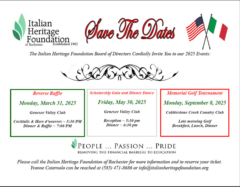 The Annual Scholarship Gala is a wonderful way to spend an evening honoring a dignified colleague, enjoying an evening of music, food and friends while helping to raise Scholarship Funds. The band The Boys of Summer will be performing following a wonderful feast of foods at the Genesee Valley Club. Black Tie is suggested but is optional. Valet Parking is provided. Tickets are available by speaking with a board member or contacting the Italian Heritage Foundation at: info@italianheritagefoundation.org or (585) 471-8686.